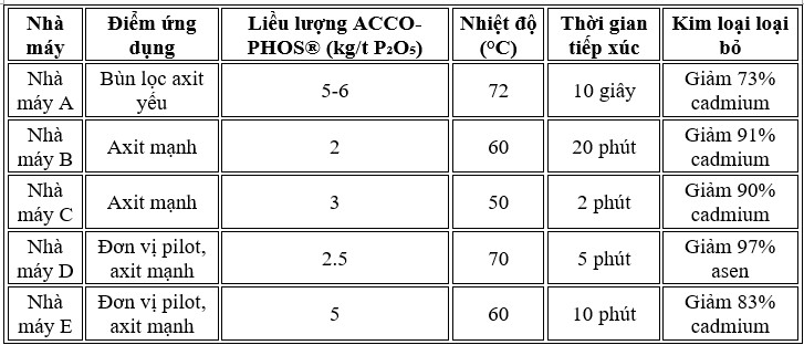 Kết quả triển khai tại năm nhà máy quy mô công nghiệp đã khẳng định hiệu quả của công nghệ ACCO-PHOS®. Tại một số cơ sở, hàm lượng arsenic được giảm tới 97% và cadmium giảm trên 90% trong axit photphoric đậm đặc.