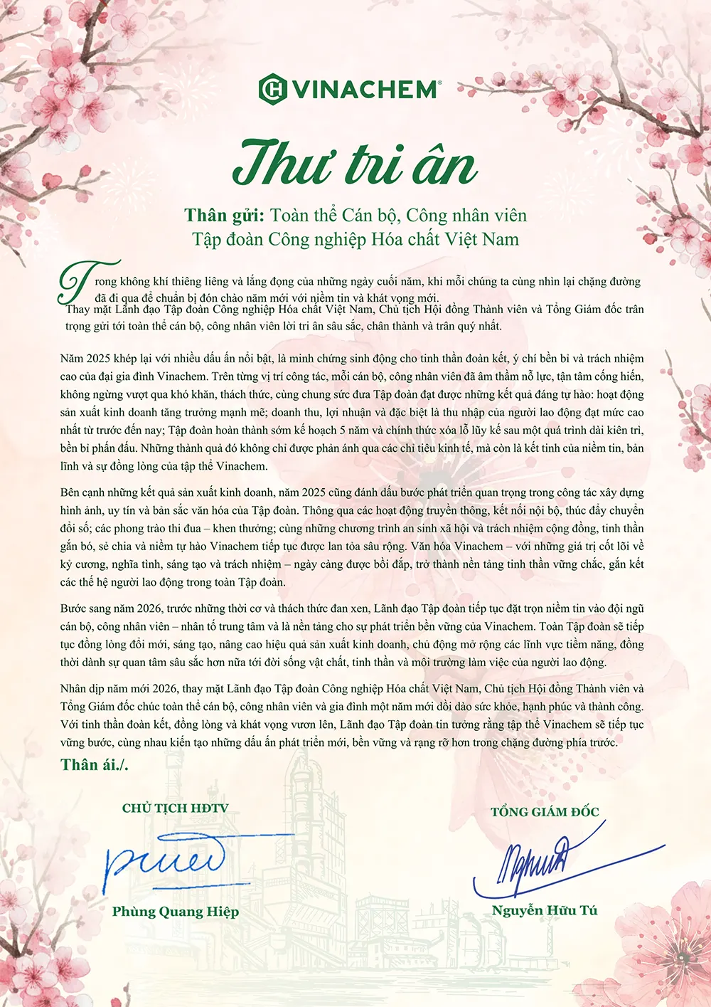 Khép lại năm 2025 với nhiều dấu ấn đáng tự hào, Lãnh đạo Tập đoàn Công nghiệp Hóa chất Việt Nam trân trọng gửi lời tri ân sâu sắc tới toàn thể cán bộ, công nhân viên – những người đã và đang âm thầm cống hiến, chung sức vun đắp cho sự phát triển bền vững của Vinachem.