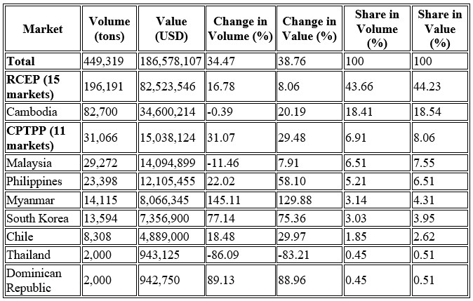 Cambodia was the largest export market, accounting for 18.4% of total volume and 18.5% of total value, with 82,700 tons worth USD 34.6 million, at an average price of USD 418.4 per ton.