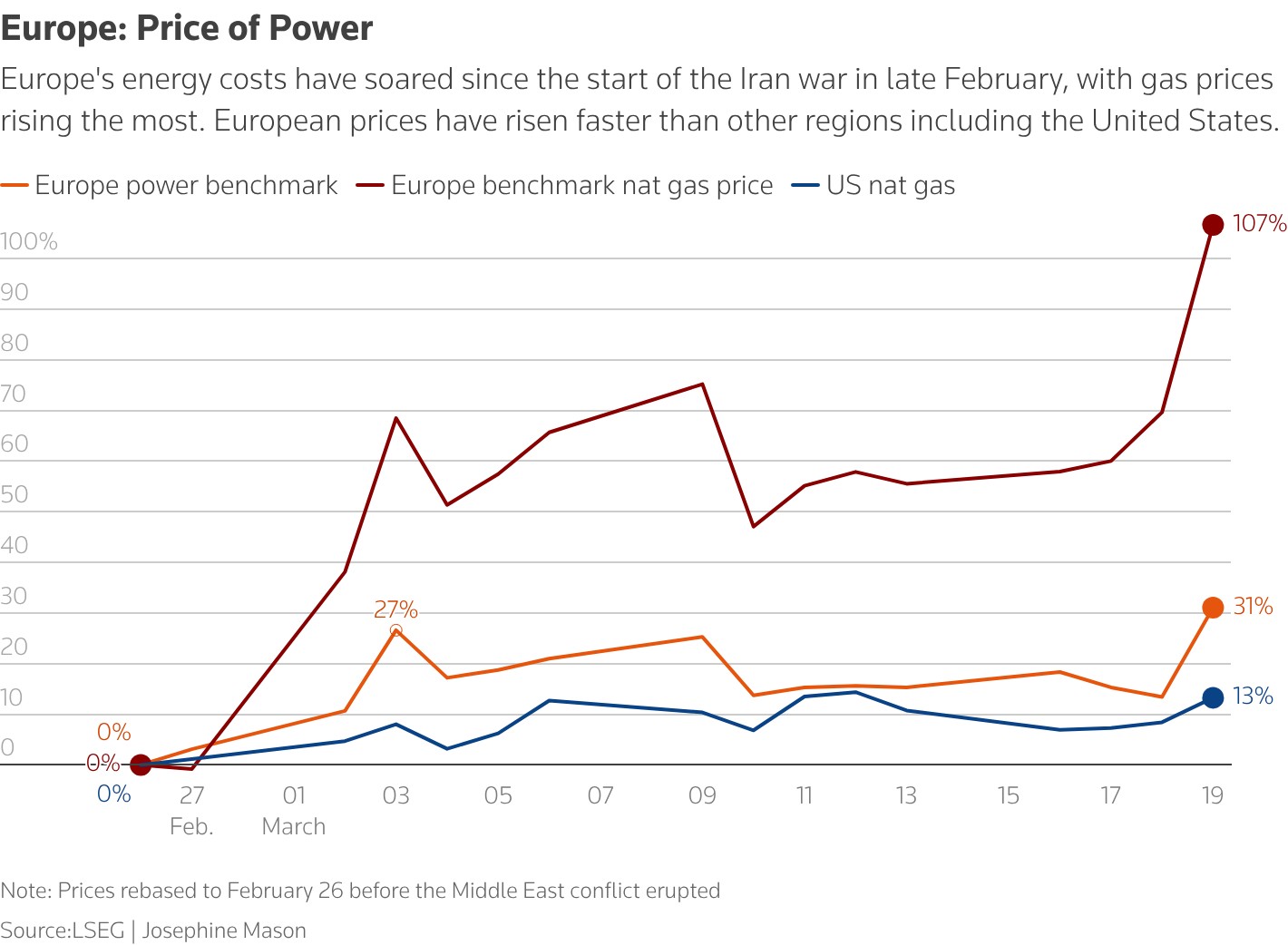 While the fallout from war in the Gulf is hitting companies worldwide, it's punching harder in Europe where energy prices are already higher than other regions, according to a dozen executives across Germany, France, Denmark and Switzerland.