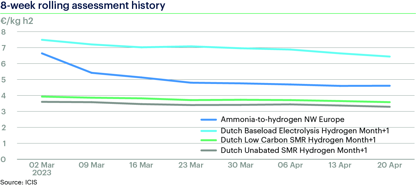The ammonia-to-hydrogen northwest Europe assessment posted a small rise of just €0.01/kg to €4.61/kg on 20 April, some €2.03/kg lower than the assessment recorded at the beginning of March.