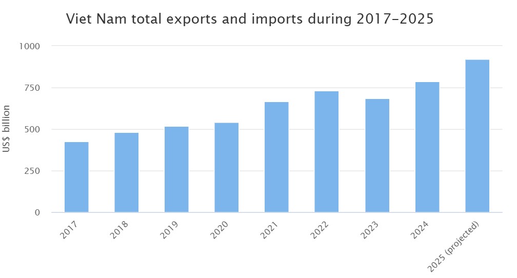 Viet Nam’s total trade volume in 2025 is estimated to reach a record high of US$920 billion, placing the country among the world’s top 15 trading nations.