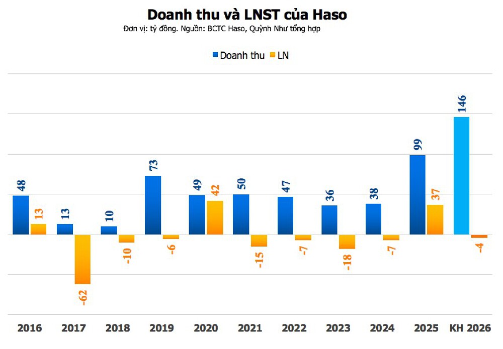 Theo đó, trong 13 năm gần nhất, Haso chỉ có 4 năm có lời là 2012 (42 tỷ), 2016 (13 tỷ), 2020 (42 tỷ) và 2025; năm lỗ nặng nhất là 2017 với 62 tỷ, 2023 với 18 tỷ, 2021 với 15 tỷ.
