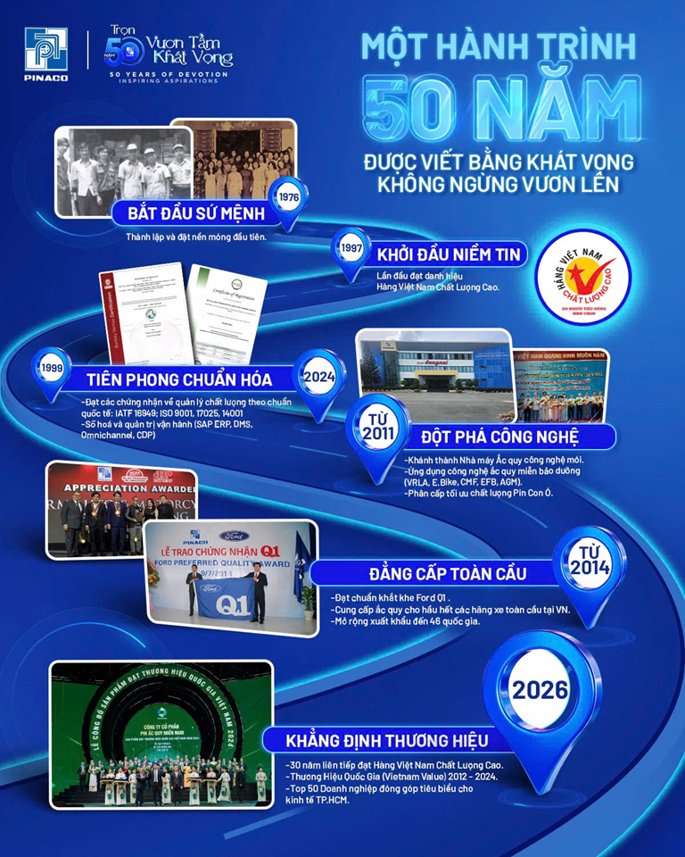 Năm 2026 đánh dấu cột mốc đặc biệt trong lịch sử ngành công nghiệp năng lượng lưu trữ tại Việt Nam – kỷ niệm 50 năm thành lập Công ty Cổ phần Pin Ắc quy Miền Nam (PINACO). Nửa thế kỷ phát triển không chỉ là hành trình tăng trưởng của một doanh nghiệp, mà còn là minh chứng sinh động cho sự lớn mạnh của một đơn vị thành viên tiêu biểu thuộc Tập đoàn Hóa chất Việt Nam (Vinachem).
