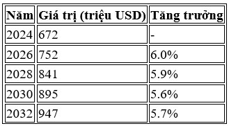 • Giá trị thị trường từ 672 triệu USD (2024) lên 947 triệu USD (2032)