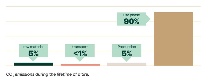 • Việc thay thế rayon trong thân lốp bằng một lớp para-aramid đơn lẻ giúp tiết kiệm 1,1 g CO2/km mỗi xe, tương đương 66 kg CO2 trong suốt vòng đời 60.000 km của lốp.