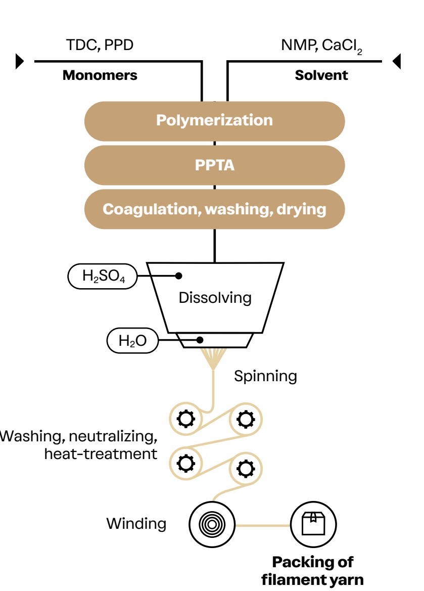 Sau khi tạo ra polymer PPTA, vật liệu trải qua các giai đoạn đông tụ, rửa sạch và sấy khô. Để có thể kéo thành sợi, PPTA được hòa tan trong axit sulfuric (H2SO4) đặc để tạo thành dung dịch kéo sợi. Dung dịch này được đẩy qua các đầu phun cực nhỏ trong quy trình kéo sợi (spinning) để tạo thành các sợi filament. Cuối cùng, sợi được rửa sạch, trung hòa axit, xử lý nhiệt để ổn định cấu trúc trước khi cuộn lại hoặc chuyển sang các công đoạn hoàn thiện khác như cắt ngắn (chopped fiber) hoặc nghiền thành bột giấy (pulp).