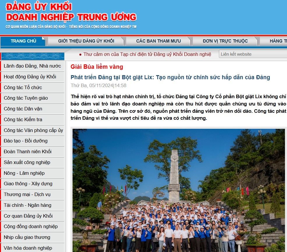Không những thế, trong năm 2024, Công ty cổ phần Bột giặt Lix vinh dự hai lần liên tiếp được công nhận Thương hiệu Quốc gia Việt Nam – danh hiệu uy tín do Chính phủ tổ chức và Bộ Công Thương chủ trì xét chọn. Đây là sự ghi nhận cho những nỗ lực không ngừng trong đổi mới, sáng tạo và nâng cao chất lượng sản phẩm, khẳng định vị thế của thương hiệu Việt trên thị trường quốc tế. Các dòng sản phẩm chủ lực như bột giặt, nước giặt, nước xả vải, nước rửa chén và dung dịch tẩy rửa mang thương hiệu LIX không chỉ đáp ứng các tiêu chí khắt khe về chất lượng, mà còn thể hiện năng lực cạnh tranh, tinh thần tiên phong và cam kết phát triển bền vững của doanh nghiệp trong bối cảnh hội nhập toàn cầu. Thành tựu này là minh chứng sống động cho hiệu quả trong công tác lãnh đạo, chỉ đạo sâu sát của Đảng ủy Công ty, đã định hướng đúng đắn về chiến lược phát triển, phát huy sức mạnh tập thể, huy động hiệu quả nguồn lực nội tại và tạo động lực thi đua trong toàn hệ thống chính trị của doanh nghiệp. Qua đó, khẳng định vai trò hạt nhân lãnh đạo của tổ chức Đảng trong việc dẫn dắt doanh nghiệp phát triển ổn định, bền vững và hội nhập thành công.