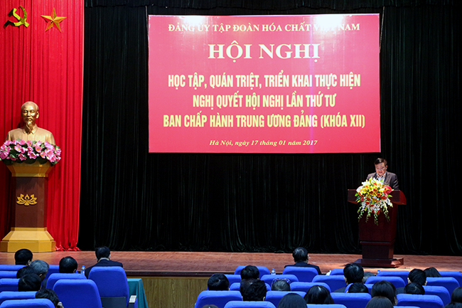 Ngày 17/1/2017, Đảng ủy Tập đoàn Hóa chất Việt Nam đã tổ chức Hội nghị học tập, quán triệt, tuyên truyền và triển khai thực hiện Nghị quyết Hội nghị lần thứ 4 BCH Trung ương Đảng (Khóa XII). Tham dự Hội nghị có đồng chí: Lê Văn Long - Phó Trưởng ban Tuyên giáo Đảng ủy Khối Doanh nghiệp Trung ương; Nguyễn Anh Dũng- Ủy viên BCH Đảng Bộ Khối DN Trung ương, Bí thư Đảng ủy, Chủ tịch HĐTV Tập đoàn Hóa chất Việt Nam; các đồng chí Phó Bí thư Đảng ủy Tập đoàn; các đồng chí ủy viên HĐTV; Kiểm soát viên, Phó TGĐ Tập đoàn; các đồng chí Ủy viên Ban chấp hành Đảng bộ Tập đoàn; Ủy ban Kiểm tra, cán bộ chuyên trách, cán bộ kiêm nhiệm làm công tác Đảng tại các đảng bộ, chi bộ trực thuộc và toàn thể đảng viên Công ty mẹ -Tập đoàn.
