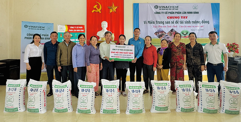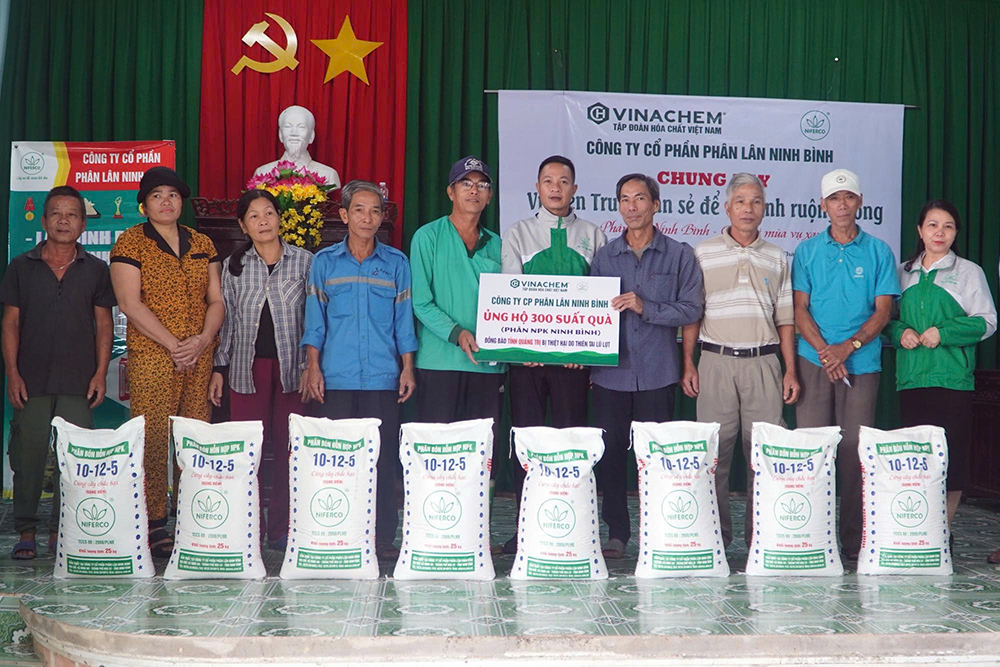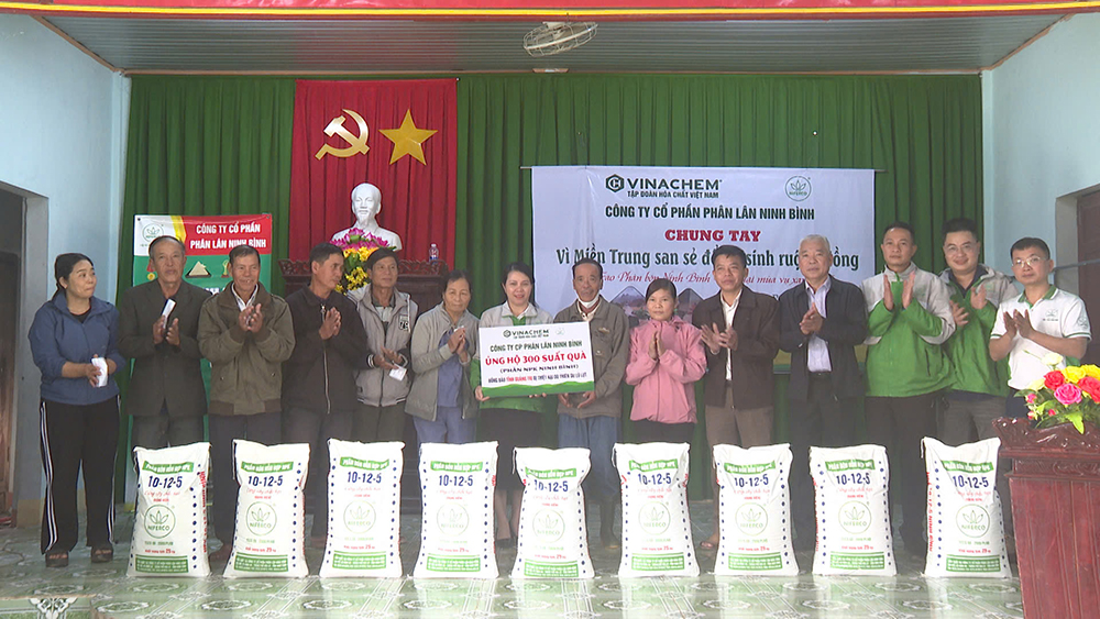 Ngày 18/12, Công ty CP Phân lân Ninh Bình (đơn vị thuộc Tập đoàn Hóa chất Việt Nam) đã tổ chức trao tặng 400 suất quà là 400 bì phân bón hỗn hợp NPK do công ty sản xuất, với tổng trị giá 130 triệu đồng cho người dân vùng ngập lụt tại tỉnh Quảng Trị và thành phố Huế.