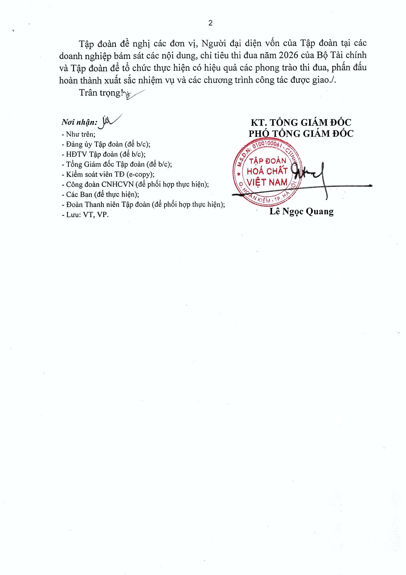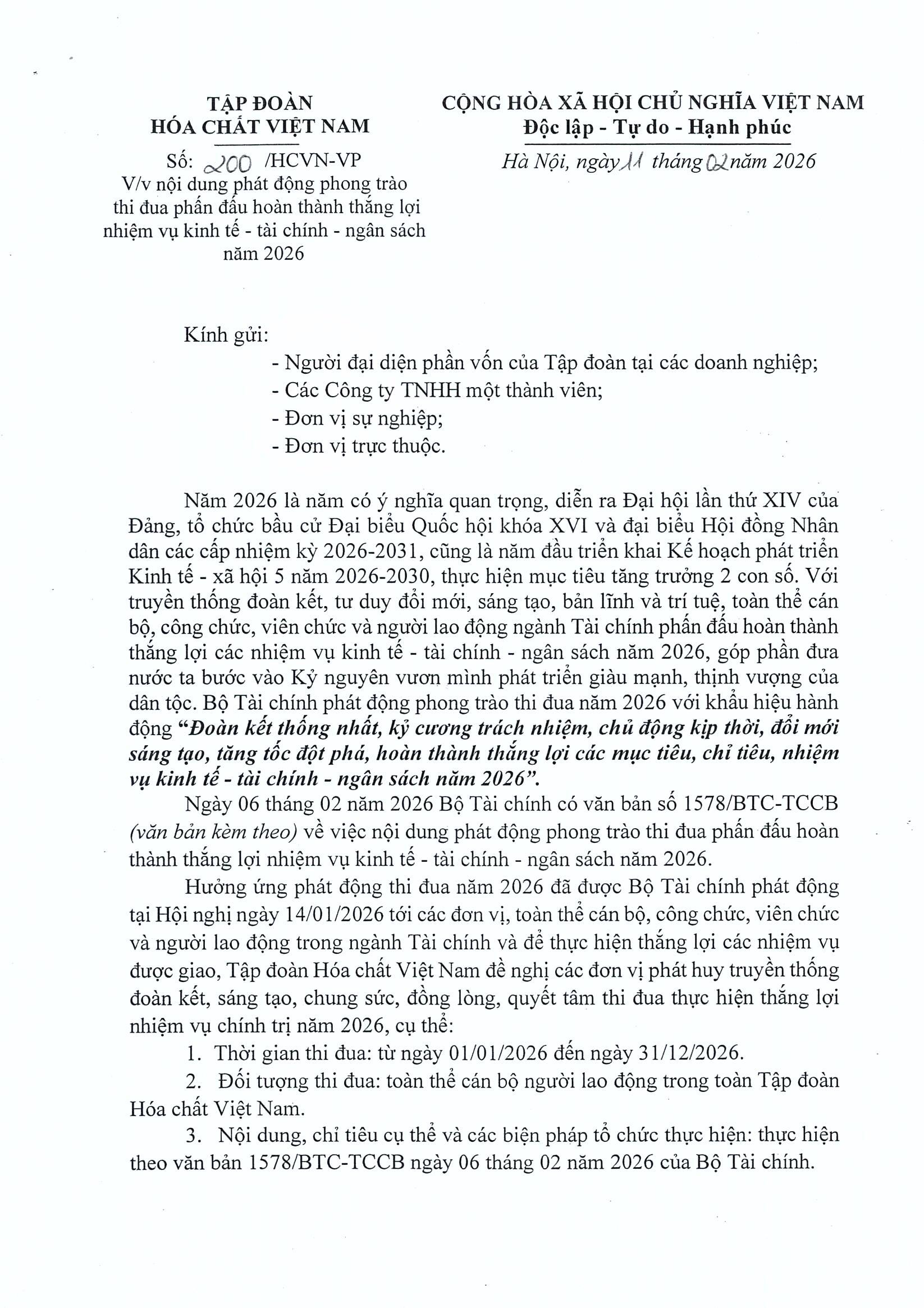 Trong bối cảnh đó, hưởng ứng phong trào thi đua năm 2026 do Bộ Tài chính phát động, nhằm tạo khí thế thi đua sôi nổi, quyết tâm hoàn thành thắng lợi các nhiệm vụ được giao, Tập đoàn Hóa chất Việt Nam đã ban hành Công văn số 200/HCVN-VP ngày 11/02/2026, chính thức phát động phong trào thi đua phấn đấu hoàn thành thắng lợi nhiệm vụ kinh tế – tài chính – ngân sách năm 2026 trong toàn Tập đoàn.