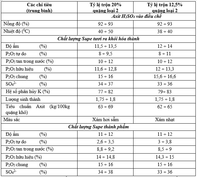 Kết quả triển khai sản xuất supe lân bổ sung quặng 2 quy mô công nghiệp (đại trà) theo các tỷ lệ sử dụng quặng loại 2 như sau: