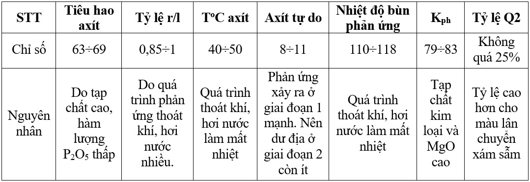 Để đưa quặng nghiền loại 2 vào sản xuất supe lân , nhóm tác giả đã tính toán và thử nghiệm tại phòng Quản lý chất lượng, sau khi tìm ra chỉ tiêu công nghệ mới tiến hành chạy thử, đánh giá rồi tiến hành chạy sản xuất đại trà tại 2 xí nghiệp Supe. Nhóm tác giả đã khảo sát các yếu tố ảnh hưởng đến quá trình điều chế supe lân: chỉ số tiêu hao axít, nồng độ axít, tỷ lệ lỏng rắn, tỷ lệ phối trộn quặng... Mỗi lần khảo sát 1 yếu tố, cố định các yếu tố còn lại. Sau khi tìm ra điểm tối ưu của 1 yếu tố, giữ nguyên điểm tối ưu của yếu tố đó và thay đổi lần lượt các yếu tố còn lại. Sau 2 tháng làm thí nghiệm tại phòng Quản lý chất lượng, kết quả tìm ra được các yếu tố tối ưu cần kiểm soát cụ thể như sau: