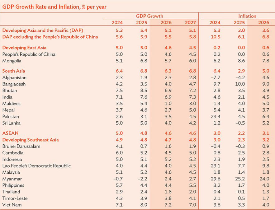 ADB dự báo tăng trưởng kinh tế khu vực châu Á đang phát triển và Thái Bình Dương sẽ giảm xuống 5,1% trong năm 2026 và 2027, so với 5,4% năm trước, do tác động của xung đột và bất ổn thương mại.