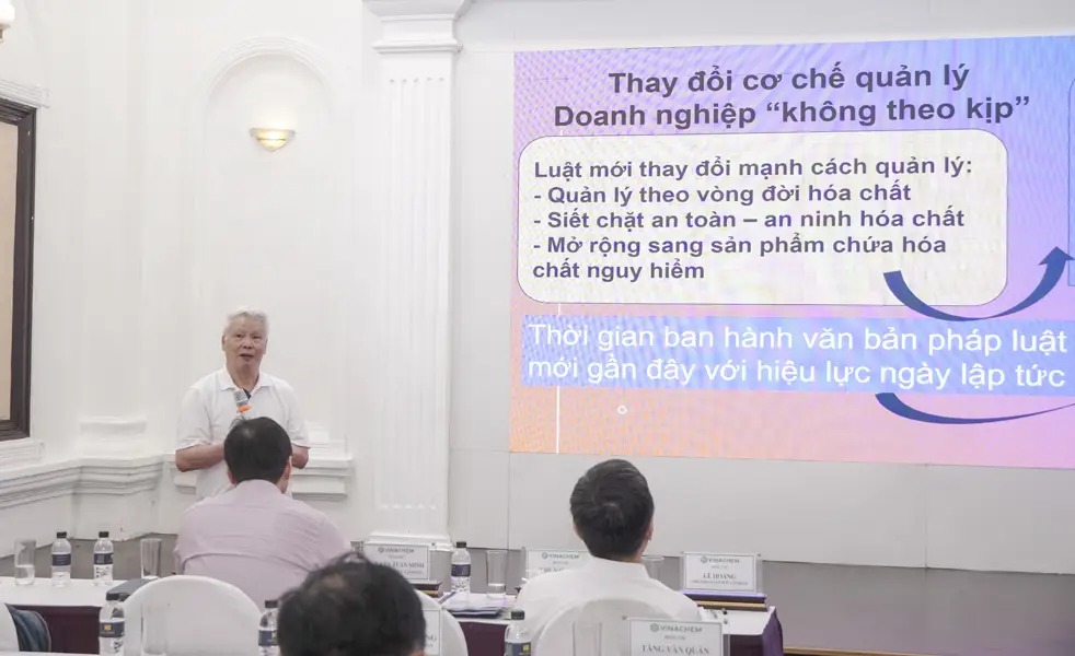 A representative from the Vietnam Chemical Society delivered a presentation analyzing the impact of the Chemical Law on chemical enterprises in the context of integration, including higher requirements for risk management, traceability, and responsibility within the supply chain.
