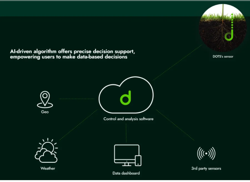 DOTS provides continuous soil nitrate data through advanced pore water extraction and spectral analysis methods. The startup’s sampling technology collects soil pore water to enable spectroscopy-based analysis for real-time nutrient level data.