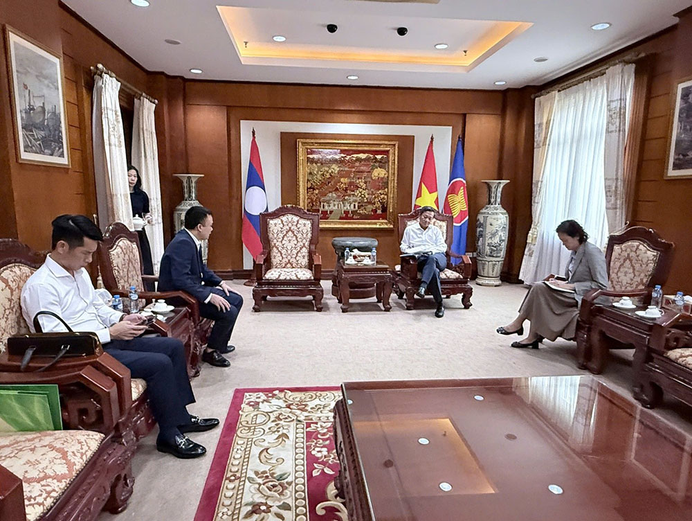 Within the framework of the business trip, the delegation had a meeting with Mr. Nguyễn Minh Tâm, Ambassador Extraordinary and Plenipotentiary of the Socialist Republic of Vietnam in the Lao People's Democratic Republic. After hearing the report on the Project's progress, Mr. Nguyễn Minh Tâm affirmed that the Vietnamese Embassy in Laos would continue to accompany and support VINACHEM in promoting investment cooperation relations in Laos in general and the Potassium Rock Salt Mine Project in particular, contributing to strengthening the special friendship and cooperation between the two countries, Vietnam and Laos.