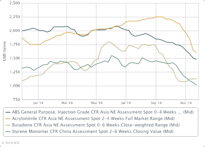 Despite the fall in feedstock costs, margins of ABS have not improved substantially since resin prices fell in tandem.