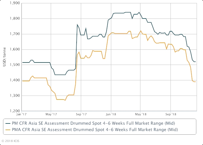 Spot prices of drummed PM were at $1,520/tonne CFR (cost and freight) SE (southeast) Asia, while those of drummed PMA stood at $1,390/tonne CFR SE Asia, according to ICIS data.