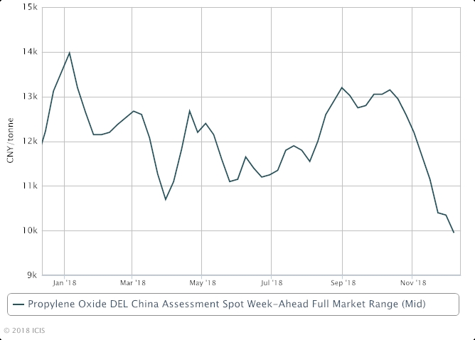 Feedstock PO prices on a delivered (DEL) China basis had plunged 24.3% from mid-October, ICIS data showed.