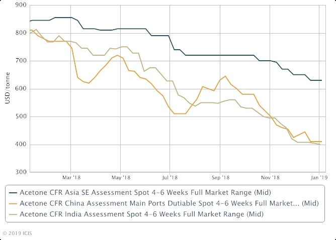 On 21 December 2018, acetone prices on a cost and freight rate (CFR) China Main Port (CMP) basis were at their lowest levels since 26 February 2016, at $400-420/tonne CFR CMP, according to ICIS data.