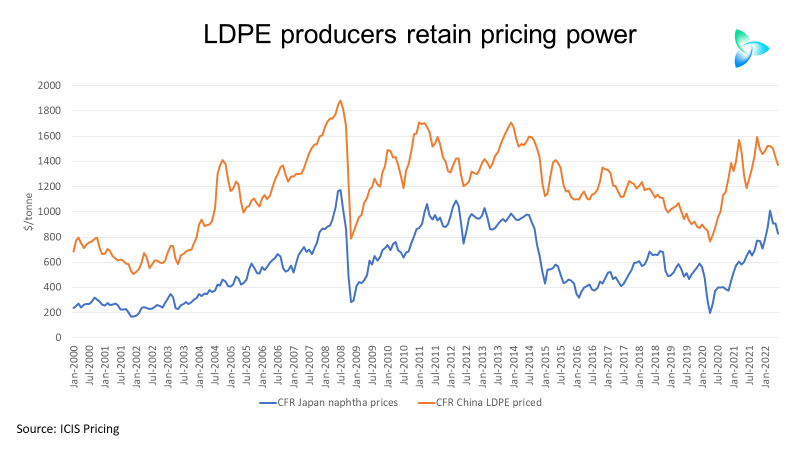 The next chart shows actual China LDPE prices versus naphtha costs since our assessments began. As you can again see, 2022 has followed the pattern of previous rapid run-ups in crude and therefore naphtha costs: LDPE producers operating in the China market have been comfortably able to pass on their extra costs to converters.