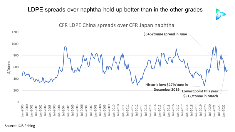 Unlike in high-density polyethylene (HDPE) and polypropylene (PP), producers have had no trouble in passing on higher naphtha costs during 2022. As you can see up until June this year, spreads have held up very well. The average monthly spread between January 2000 and December 2021 was $599/tonne. In January-June this year, it was $588/tonne.
