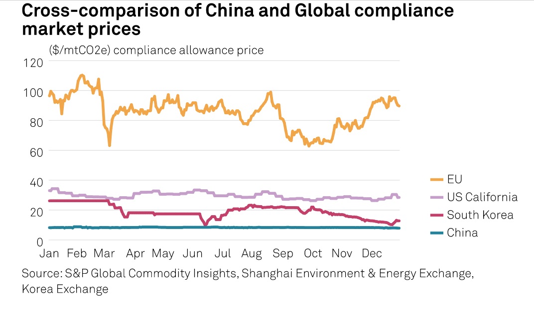 The daily weighted average price of China Emission Allowances, or CEAs -- which represent the carbon price in the national compliance market -- was Yuan 51.23/mtCO2e (about $7.35/mtCO2e) at launch in July 2021, and averaged Yuan 58.07/mtCO2e ($8.34/mtCO2e) in 2022.