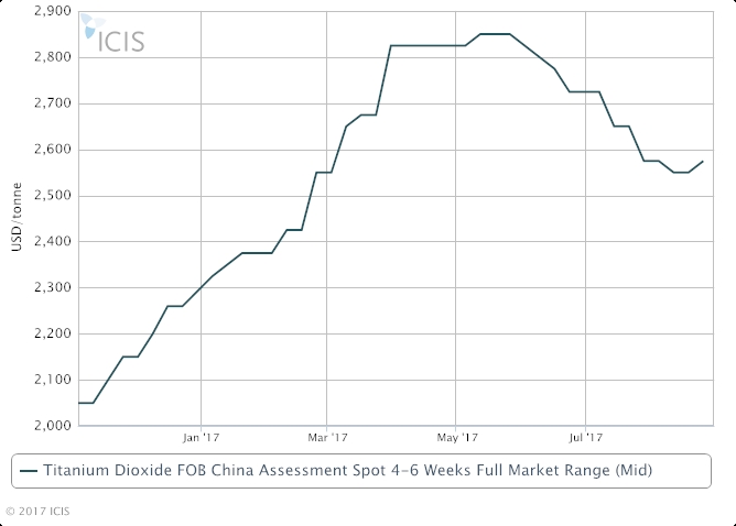 TiO2 export prices have fallen by 11% from 26 May to 11 August, ICIS data showed, having been under pressure owing to growing inventory levels amid weak domestic buying.