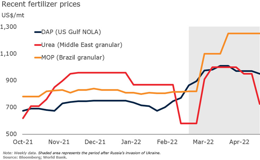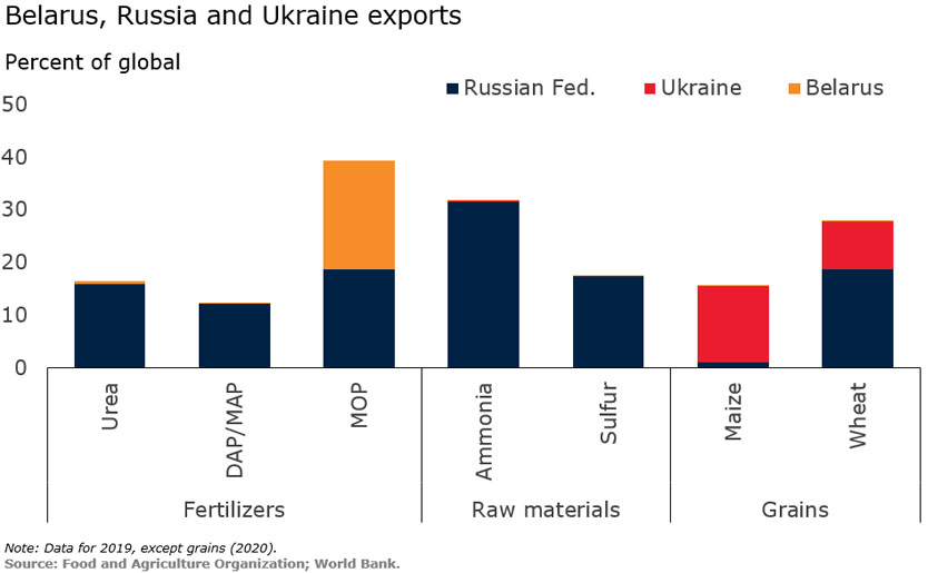 Sanctions and export restrictions. Fertilizer prices rose in response to the war in Ukraine, reflecting the impact of economic sanctions and disruptions in Black Sea trading routes. Russia accounts for about 16% of global urea exports and 12% of DAP and MAP exports , while Russia and Belarus together make up two-fifths of global MOP exports. Adding to supply concerns, China has suspended exports of fertilizers until at least June 2022 to ensure domestic availability.