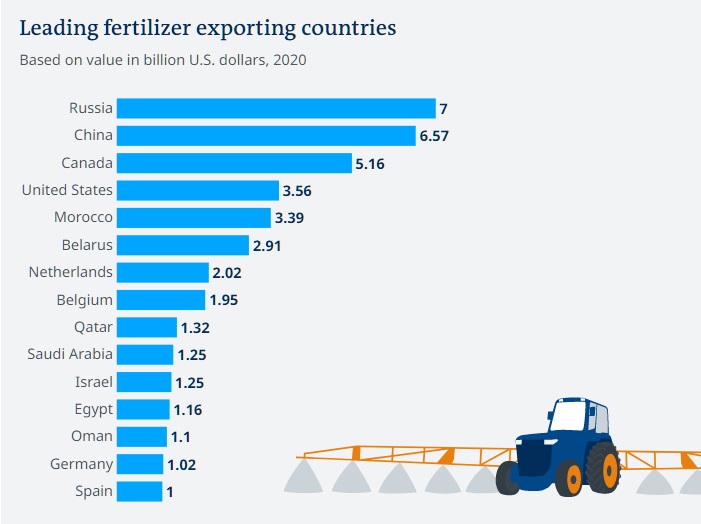 A top fertilizer producer, Russia accounts for 15% of global trade in nitrogenous fertilizers and 17% of global potash fertilizer exports, according to the Food Policy Research Institute. The country is also responsible for 20% of the global natural gas trade, a key component in manufacturing fertilizers.