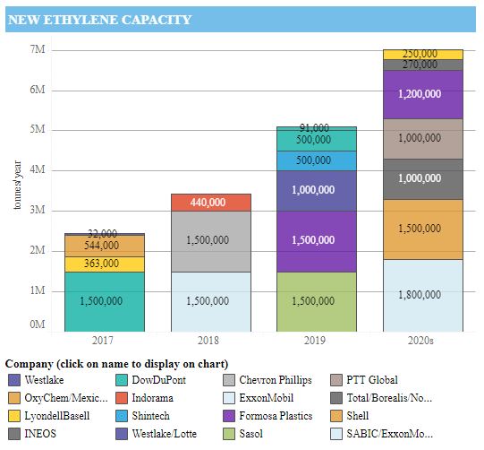 Several new crackers are starting production in late 2018 or early 2019, including an Indorama unit, a Sasol unit and a Shin-Etsu unit. Several more are expected to start up later in 2019.