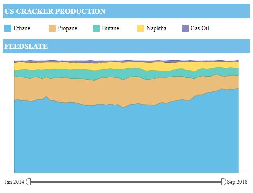 The share of ethane in the US feedslate rose above 75% by mid-2018, up from the 60s% in the prior year.