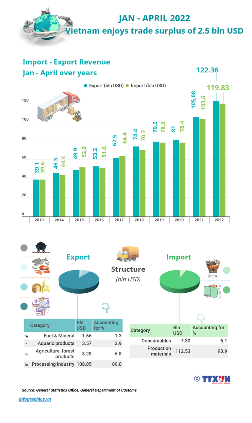 Vietnam recorded a trade surplus of US$ 2.53 billion in the first four months of this year, doubling that of the same period last year, indicating continued recovery.