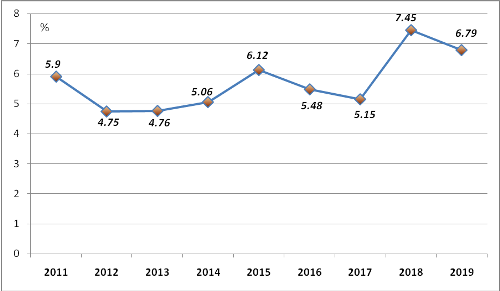 The GDP growth in the first quarter of 2019 is lower than the same period last year but still higher than the same periods of the previous years in 2011-2017 phase