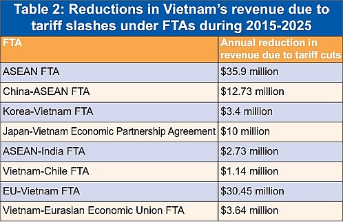 According to the World Bank, during 2015-2025, Vietnam will directly see a slump in import tariff revenue from $1.43 billion to $477.3 million, due to import tariff cuts under FTAs (see Table 2). Also, the indirect reduction in import tax revenue from FTAs during 2016-2025 will be $5.96 billion, with an average $591 million each year.