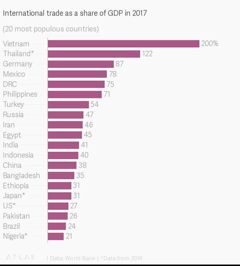 Viet Nam’s trade as a percentage of gross domestic product (GDP) reached over 200 per cent in 2017, the highest level for any country with over 50 million people in the World Bank’s data set, which goes back to 1960.
