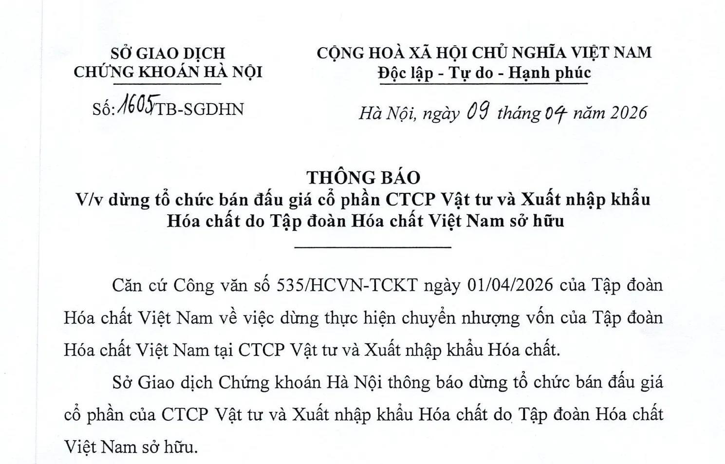 Ngày 09 tháng 04 năm 2026, Sở Giao dịch Chứng khoán Hà Nội thông báo số 1605/TB-SGDHN về việc dừng tổ chức bán đấu giá cổ phần của CTCP Vật tư và Xuất nhập khẩu Hóa chất do Tập đoàn Hóa chất Việt Nam sở hữu.