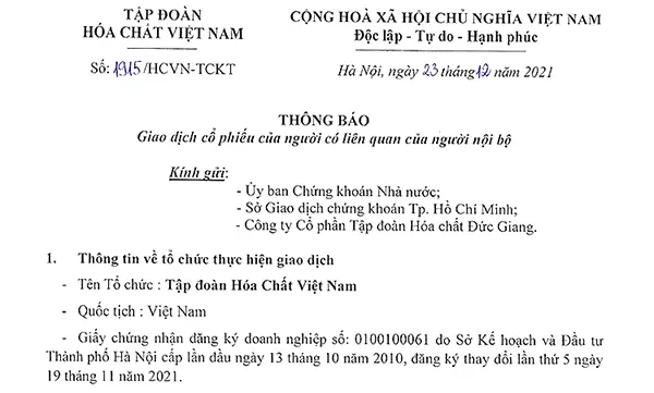 Thông báo tiếp tục chuyển nhượng vốn của Tập đoàn Hóa chất Việt Nam tại Công ty Cổ phần Tập đoàn Hóa chất Đức Giang như sau:XEM TIẾP05:17 CH @ 11/02/2022