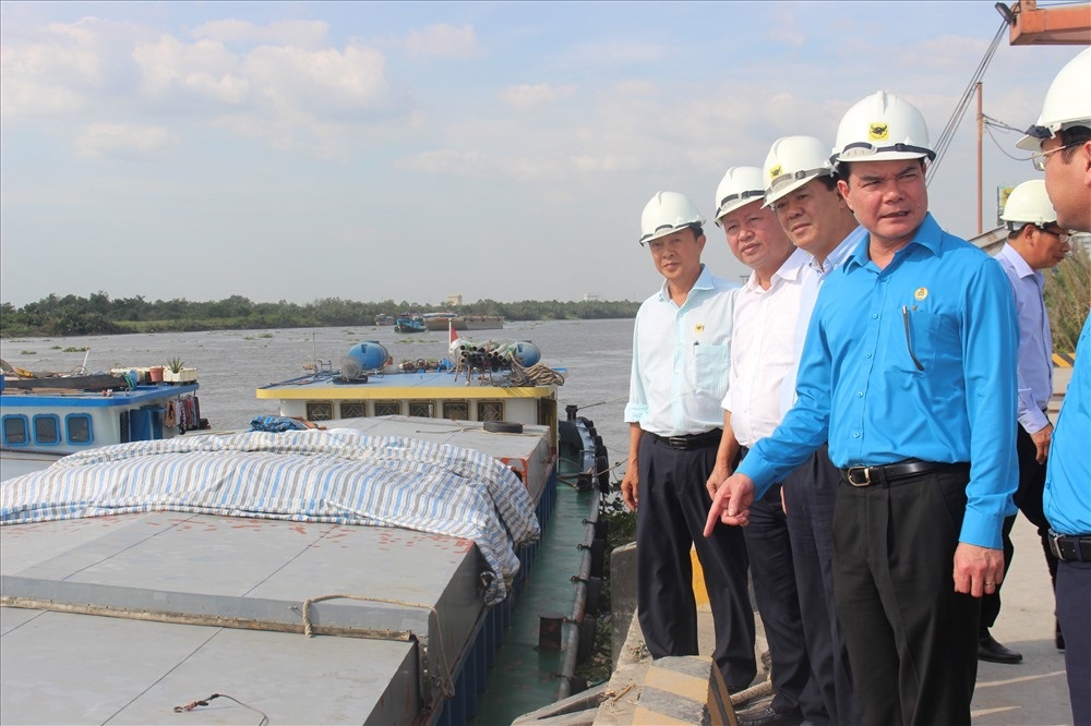 Đoàn công tác thăm bến cảng bên sông Vàm Cỏ Đông của công ty. Ảnh: K.Q