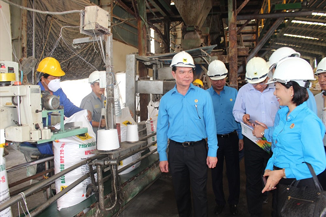 Chủ tịch Tổng LĐLĐ Việt Nam thăm dây chuyền sản xuất phân bón tại công ty. Ảnh: K.Q