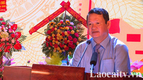 Đồng chí Nguyễn Thanh Hà, Bí thư Đảng ủy Công ty Apatit Việt Nam đọc diễn văn kỷ niệm.