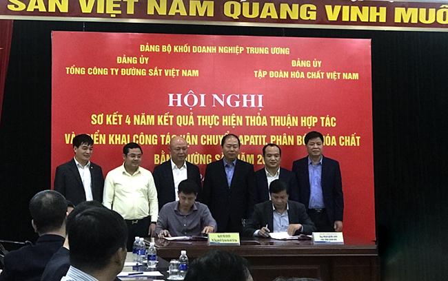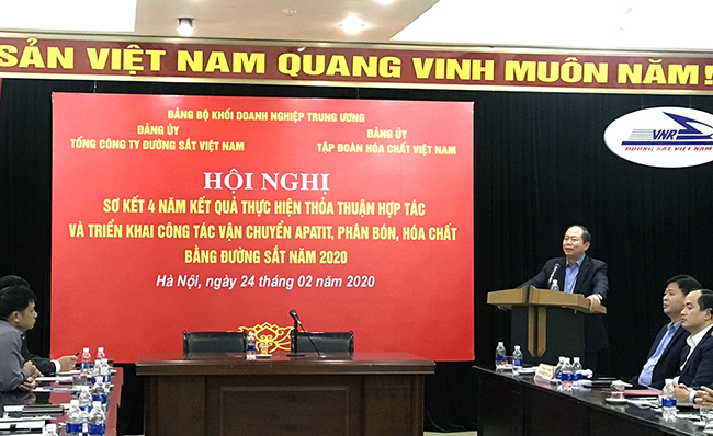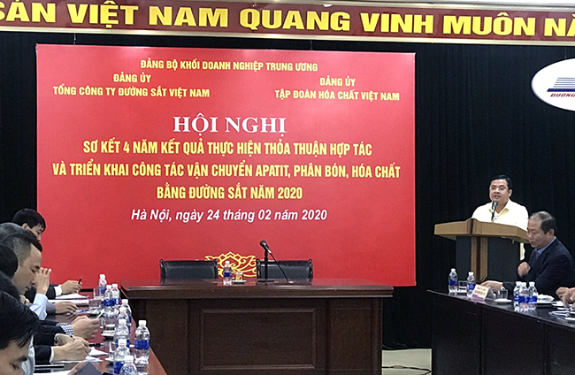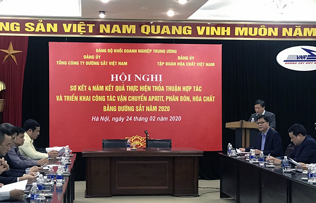Chiều ngày 24/2/2020, tại Hà Nội, Đảng ủy Tổng Công ty Đường sắt Việt Nam (TCT) phối hợp Đảng ủy Tập đoàn Hóa chất Việt Nam đã tổ chức Hội nghị sơ kết 4 năm kết quả thực hiện thỏa thuận hợp tác và triển khai công tác vận chuyển apatit, phân bón, hóa chất bằng đường sắt Việt Nam.