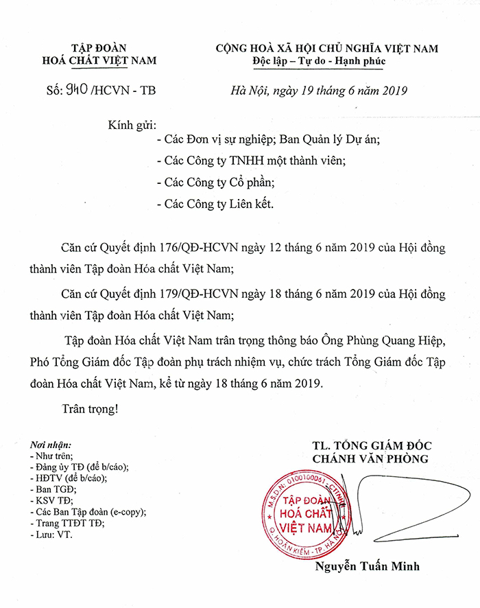 Ông Phùng Quang Hiệp phụ trách nhiệm vụ, chức trách Tổng Giám đốc VINACHEM