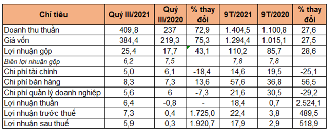 Phân bón miền Nam (HoSE: SFG) công bố doanh thu quý III đạt 410 tỷ đồng, tăng 73%. Giá vốn tăng cao hơn do thực hiện phương án sản xuất “3 tại chỗ”. Do vậy, lợi nhuận gộp đạt 25,4 tỷ đồng, tăng 43%. Biên lợi nhuận gộp giảm từ 7,5% xuống 8,3%.