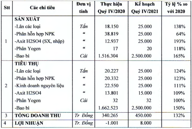 Cụ thể, sản lượng tiêu thụ đạt 25.000 tấn phân lân các loại, tăng 25%; 25.000 tấn phân hỗn hợp NPK, tăng 23; 25.000 tấn kinh doanh nguyên liệu, tăng 11%; 15.000 tấn axit H2SO4, tăng 9% so với cùng kỳ năm trước. Doanh thu 450 tỷ đồng, tăng 32% và lợi nhuận 8 tỷ đồng, cùng kỳ năm trước lỗ 1 tỷ đồng.