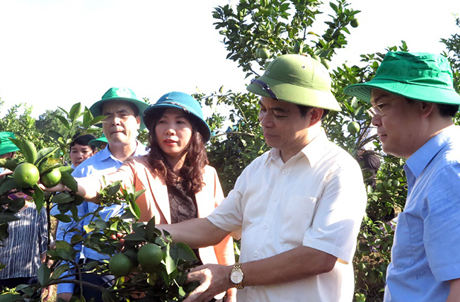 Phó Chủ tịch UBND tỉnh Nguyễn Thanh Hải thăm quan mô hình trồng cây ăn quả có múi của gia đình bà Nguyễn Thị Thủy ở khu 7, xã Tiên Kiên
