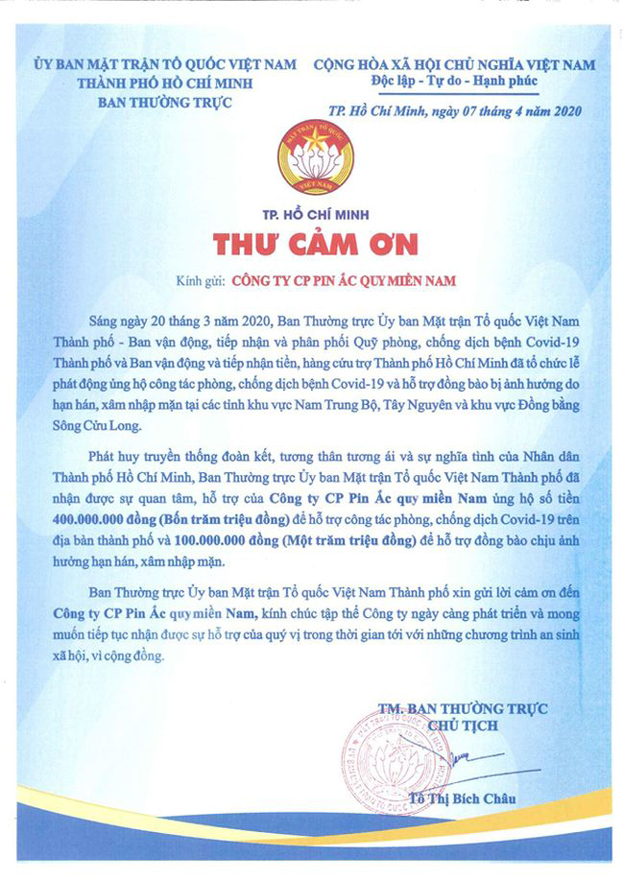 Thực hiện trách nhiệm của doanh nghiệp đối với xã hội và cộng đồng, ngày 8.4, Tổng Giám Đốc Công ty Cổ Phần Pin Ắc Quy Miền Nam (PINACO) – Ông Lê Văn Năm đã trao 500 triệu đồng thông qua Ủy ban mặt trận Tổ quốc Việt Nam TP. HCM chung tay cùng cả nước phòng chống dịch Covid-19 và hỗ trợ đồng bào Miền Tây bị thiệt hại do hạn hán, xâm nhập mặn.