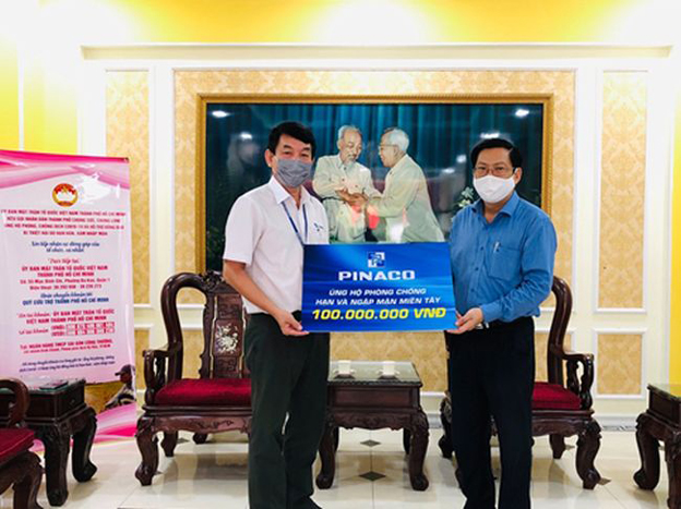 Đồng thời, PINACO cũng đã trao tặng 100 triệu đồng thông qua Ủy ban mặt trận Tổ quốc Việt Nam tại TP. HCM tiếp sức đồng bào các tỉnh Miền Tây đang gặp khó khăn do ảnh hưởng khốc liệt của biến đổi khí hậu, hạn hán, xâm nhập mặn.