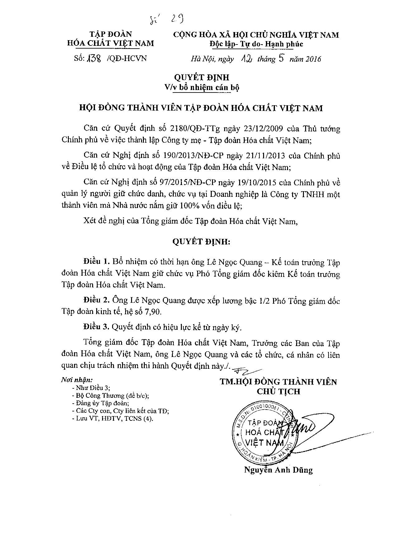 Hội đồng Thành viên Tập đoàn Hóa chất Việt Nam vừa ban hành Quyết định bổ nhiệm có thời hạn ông Lê Ngọc Quang -Kế toán trưởng Tập đoàn Hóa chất Việt Nam giữ chức vụ Phó Tổng giám đốc kiêm Kế toán trưởng Tập đoàn Hóa chất Việt Nam kể từ ngày 12/05/2016.